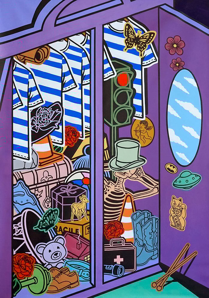 Step into ROOM14, a fascinating universe full of every day colorful objects dizzily tumbling over each other before your very eyes all vying for attention. These paintings are the result of ERK14’s practice, which is that of seeing an object and from there creating a story, combining it with other objects, where there is always a question and an answer, and drawing to create things that in reality cannot be seen or touched, which is why ERK14’s work is very reminiscent of surrealist painting. In his pictorial style, he simply tries to transform a graphic sign into a pictorial one, with all its rules. Then again he is very aware that artists are standing on the shoulders of giants and likes to think that Italian painters should continue the tradition of painting done in a certain way since he always admired the Greek and Roman art he saw in Pompeii and in the museums of Naples, and everything from the Renaissance to Magritte and Roy Lichtenstein. Immerse yourself in ERK14’s world and let it sweep you off your feet in a space that at the same time exists and doesn’t exist.
